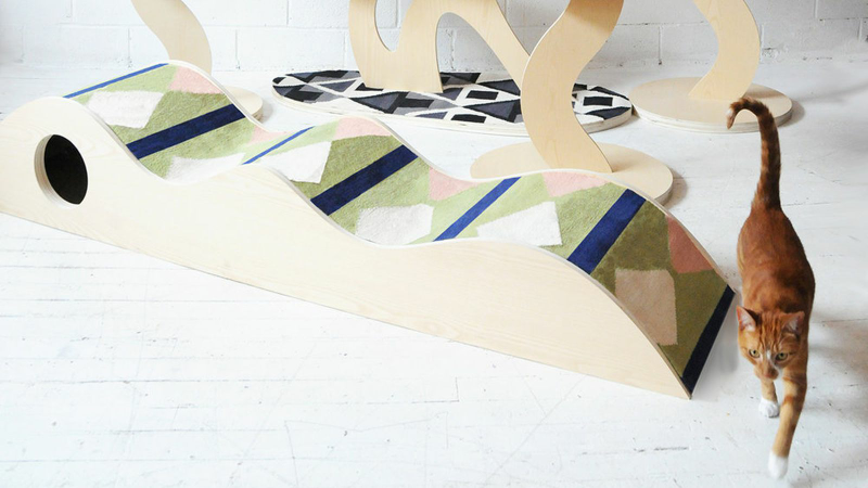 Yarfie is a series of curving "cat furniture" pieces made from ash plywood and boldly patterned flat weave rugs.